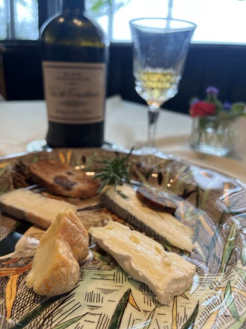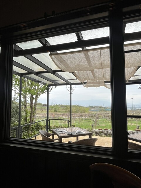 テーブルに飾られた美しい絵柄のお皿、奥に控える食後酒の数々、窓から広がる葡萄畑。胸が高鳴ります。