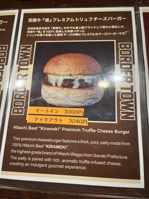 常陸牛の中でもプレミアムブランドである「煌」を使用した、常陸牛「煌」プレミアムトリュフチーズバーガーを注文。