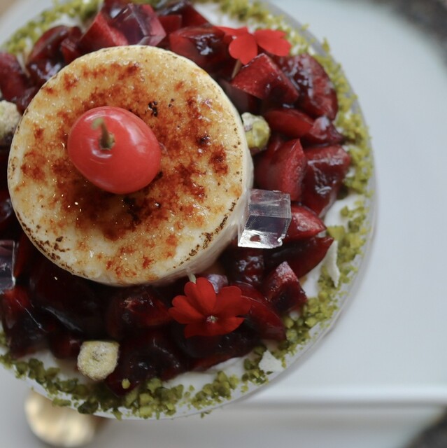 ジャスミン香る宮崎マンゴーとアメリカンチェリーのピュイダムール仕立て杏仁とフランボワーズ風味