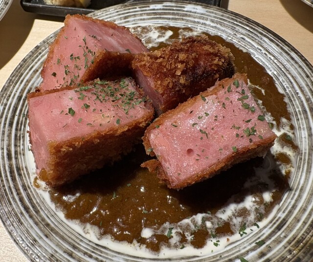 ハムカツは分厚さにも驚きですが、カレーソースが本格的で白飯と食べたいくらいの美味しさでした。