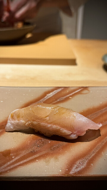 料理は「つまみ」と「握り」で構成されるおまかせコース。長崎や福島など九州各地の魚を中心に、佐賀県産の米「さがびより」、島根県産の希少な美笑(みしょう)わさび、糸島の醤油などを使用。宮崎県産の日高備長炭を使った炙りや、温かいシャリと冷たい魚を対比させる握りなど、繊細な技が光る 。