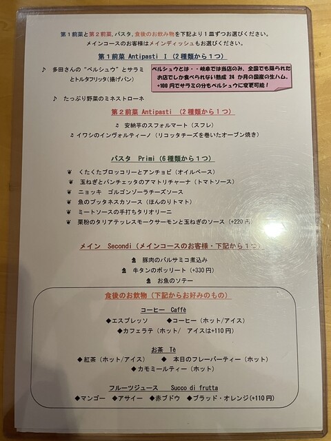 パスタのランチコースは2000円代。中途半端な麺類のお店に行く位なら、こちらを選んでしまいます。結果、思い付きランチで直前電話してお伺いすることもよくあり、河合シェフにはいつもご無理を言っております汗