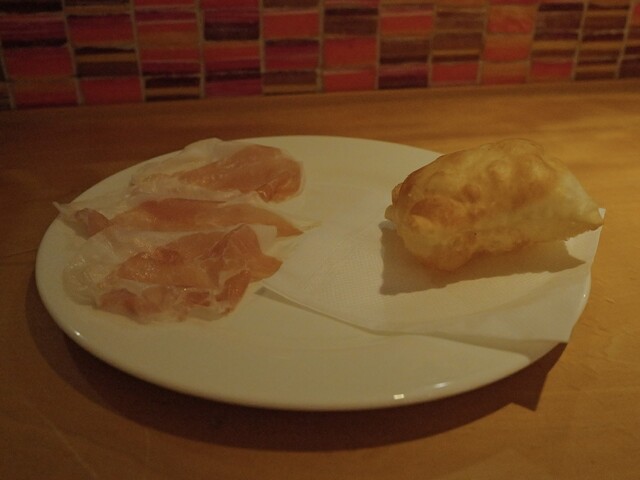 ペルシュウをトルタフリツタに乗せて頂くのが本場エミリア・ロマーニャ州の食べ方。これがとっても軽やかな食べ方で美味しい。ランブルスコが飲みたくなりますね〜