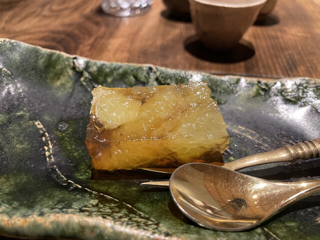 →舌触り滑らかで落花生の甘みがよくら感じられる豆腐。無花果との質の違う甘みとよく合います。そして煎りたての落花生の香りも素晴らしく。初物銀杏の香りも加わり、スタートから気分が上がりますね♪