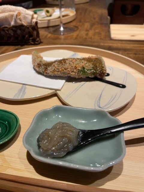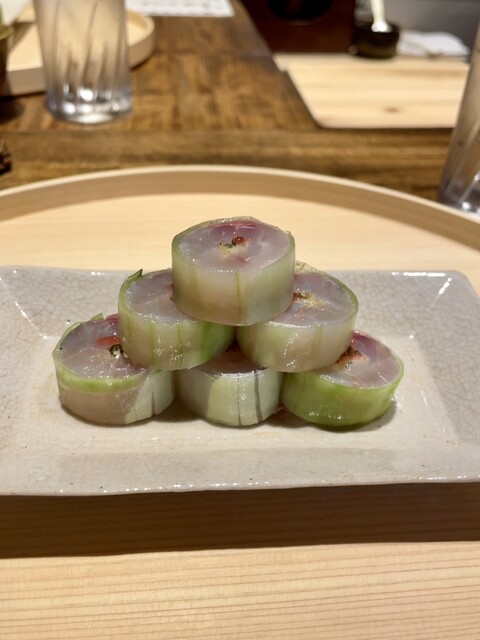 →来ました!胡瓜嫌いの私でも大好きな鯵の胡瓜巻き。今日の鯵は桜海老ではなく、鰯を食べて栄養が脂に乗った鯵とのこと。う〜ん。このサラサラな脂に乗る旨みが深い。流石、鰯の栄養を脂に蓄えている鯵。美味しいなぁ〜(´∀`)