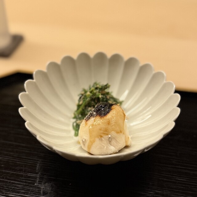 ⑥炭火焼き虎河豚白子(山口県下関産)、芹菜の胡麻和え添え