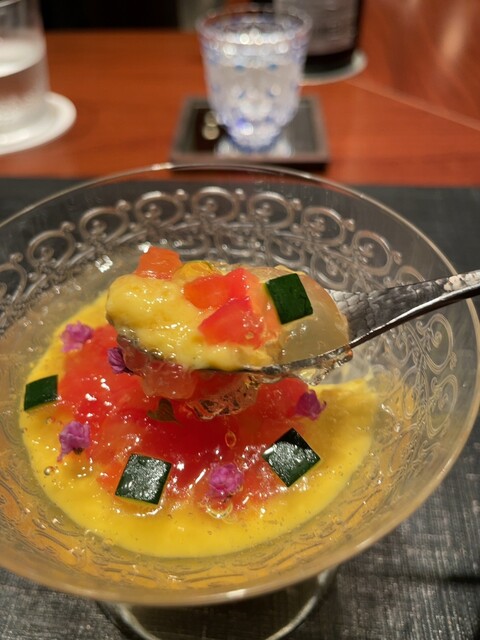 →見た目の美しさに気分が上がりますね♪玉蜀黍のしっかりとした甘み、フルーツトマトの爽やかな酸味、ズッキーニの食感とほんのり苦味。様々なお野菜の要素が調和した見事な一品でした。