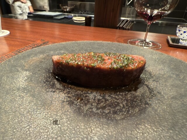 背側の味わいがとても面白いですね。シェフ曰く、背の赤身をレバーに見立ててレバ刺しのイメージで決めてみたとのことで、確かにこれはレバ刺し!この発想力が金田シェフならではなんですよね(´∀`)