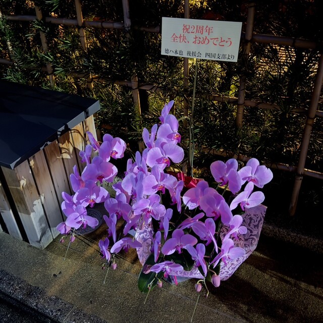 お店の前に着き、まず目に入ったのは、「祝2周年 全快おめでとう」のお花。後援会四国支部より贈られたお花のようです♪すぐに送り主様に写真付きでご連絡いたしました(笑)