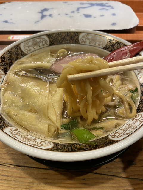 スープは灰色に濁ったスープは、煮干しの破片が浮いています。