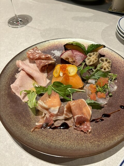 前菜の盛り合わせはいつ見てもうっとりする美しさ。カジキマグロの生ハムのピザはポルチーニ茸の香りがたっていて塩味も丁度よく最高に美味しい。外せない一品です。