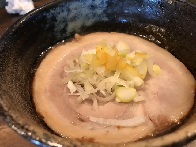 そして、次は、日本蕎麦の様に、コップ状の器に食べる分だけの麺を取り、漬け汁へ入れ、また、器に戻して啜る。こら、うまい。鰹節、昆布等の香りが漂い、美味しい。つけ麺だから、流石にスープ自体は濃いが、我慢出来ない濃さではない。