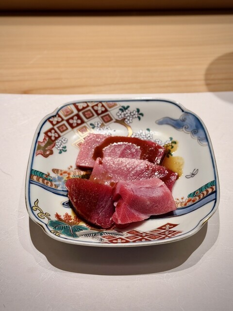 見目麗しい中トロと赤身。そこに添えられたのは、わさびではなく辛子醤油。その鋭い切れ味が、鮪の持つ旨味と脂の豊かさを際立たせ、ひと口ごとに芯のある力強さが口内を支配する。