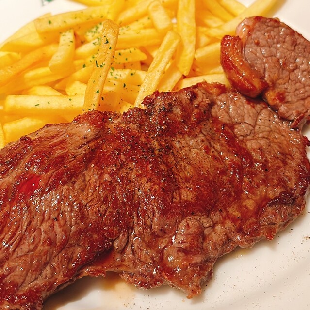 メインは【ブラックアンガス牛もも肉のステーキとフレンチフライ】を