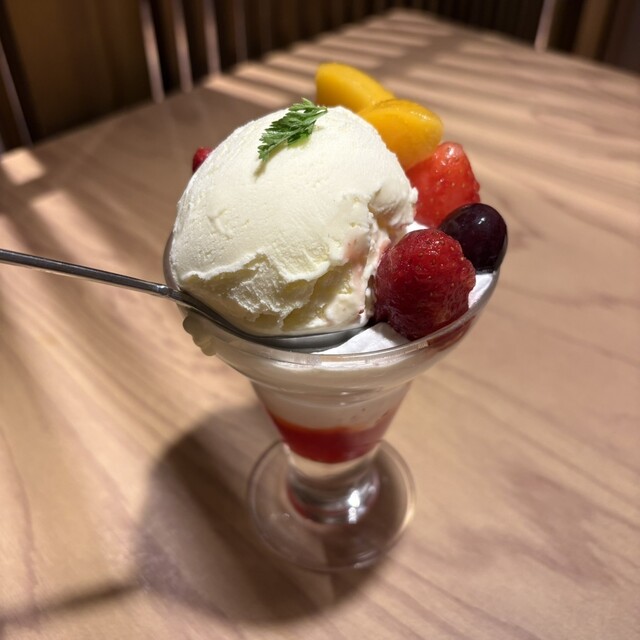 フルーツとアイスの下はホイップクリーム、1番下は苺ソース。