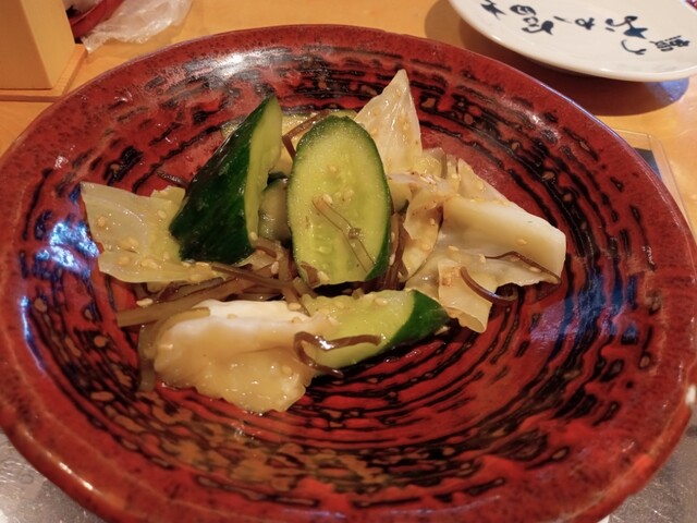 きゅうりと塩昆布の浅漬けで配膳を待ちます。
