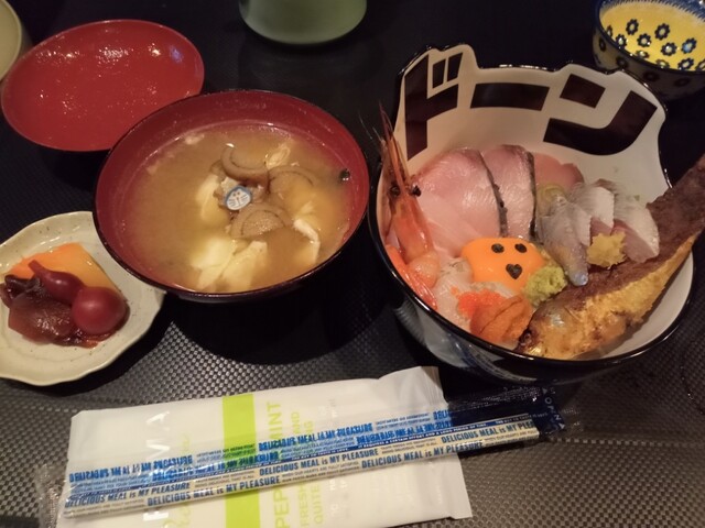 暫しの後に配丼。丼には「ドーン」って書いてありますが、小さ目の丼です(小笑)。内容は海鮮丼・お味噌汁・お漬物です。