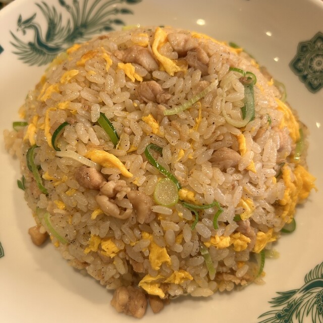 チャーシュー、卵、ネギ、が入ったシンプルな醤油味の国産米を使用したパラパラチャーハン。大盛は結構な量です。