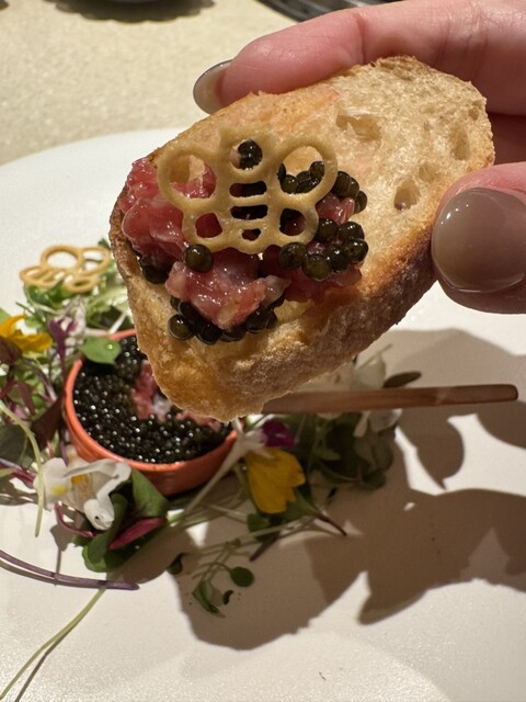 最初から豪華で、ユッケの上にキャビアが敷き詰められていて、鉄板で焼いてくれるバケットと一緒にいただきます。