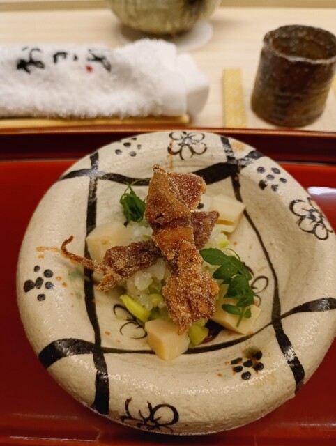 白魚の玉締め、鯛の谷中生姜煮、岩海蘊、粟麩の照り焼き、アオリイカ、スナップエンドウ、焼き芋天麩羅、シラスの和え衣