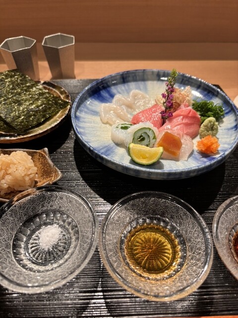 これはレギュラーメニューですね、海苔で巻いて食べる手巻き御造り!今日はカボスのお椀で夏全開でした♪