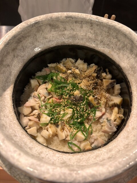 一つ目は5種の貝が入ったごま油香る炊き込みご飯に牛肉のしゃぶしゃぶ乗せ