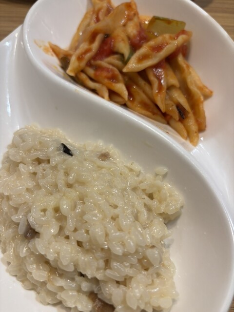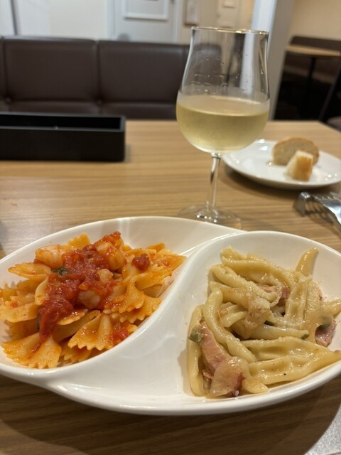 左海老のバジリコトマトソース右ベーコンと玉葱のバターソース