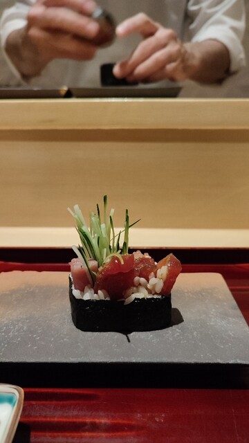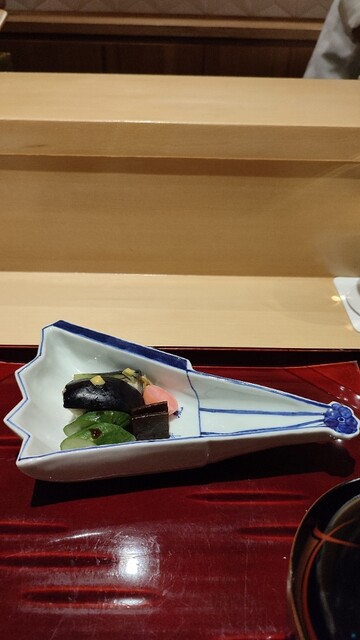 紫蘇の花がいいアクセントで香り良く、べったら漬けの濃厚な甘さに食感がマグロとよく合い美味しいです
