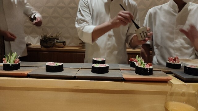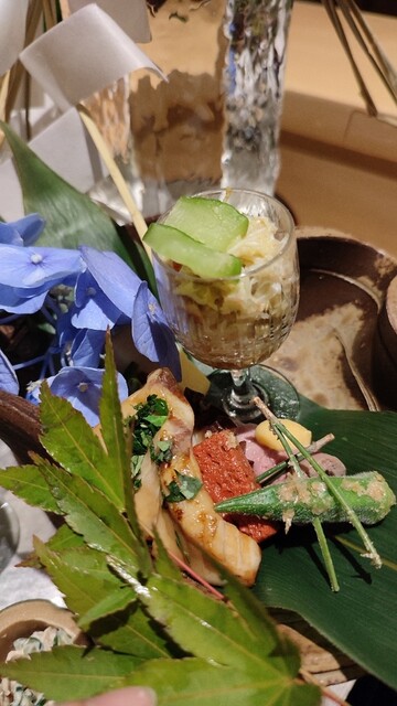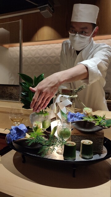 しのはらさんの盛り付けは他のお店にはない立体さと、提供する際のお店の照明を落とす芸術的な登場の仕方が唯一無二です