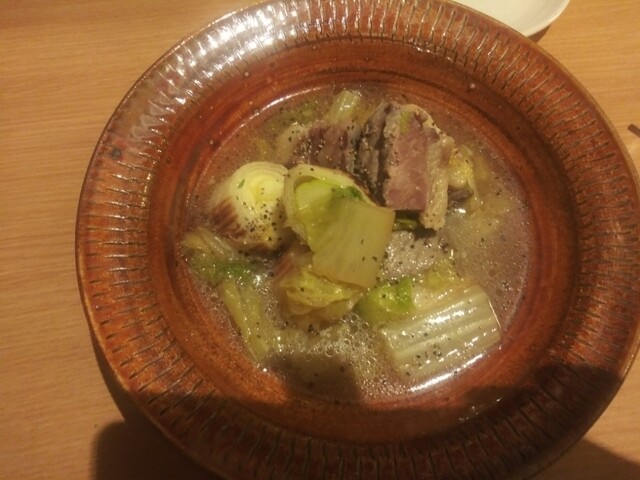 この日のメニューで一番良かったのは軍鶏の出汁がきいたラーメン。メニューには「鶏出汁ラーメン」とだけさらっと書いてあったが、話を聞いてみると青森の軍鶏で取った出汁に皮を炙った軍鶏が入ったものとのこと。一般的な鶏出汁とは違うしっかりとした味と風味。