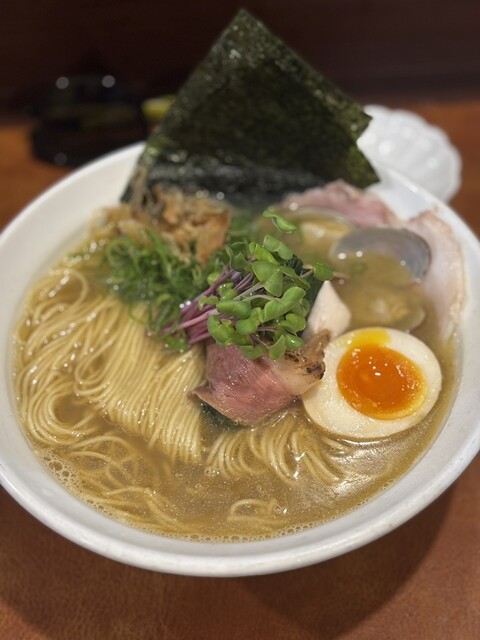 ラーメンのビジュアルが綺麗。チャーシューは3種類で鴨と豚と鶏胸。鶏胸と鴨は感動的。かいわれ、アサリ、カツオ節、海苔、ほうれん草、味玉がトッピング。麺は細麺でぷりぷり。スープは貝や煮干しの旨みがすごい。ここまでのスープの完成度は都内でもないのではないかと思うほど。100名店でもレベルは上だと思えるほど。