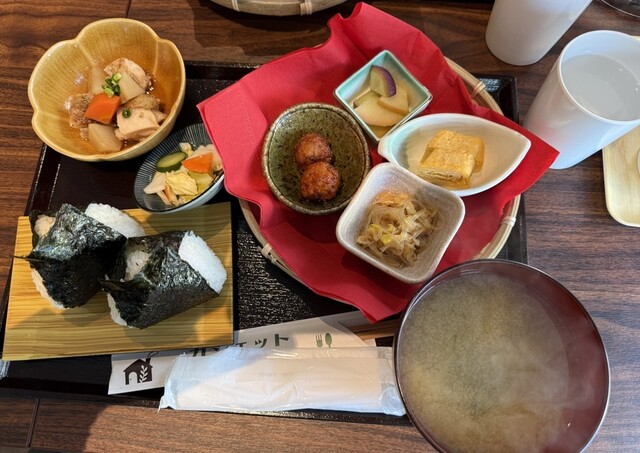 席についてしばらくすると食事が運ばれてきました。大ぶりのおにぎりが2個と味噌汁はおかわり自由だそうですが、ほとんど初めのセットでおなかがいっぱいになりました。頑張ってもう1個食べましたが、それ以上入りませんでしたね。