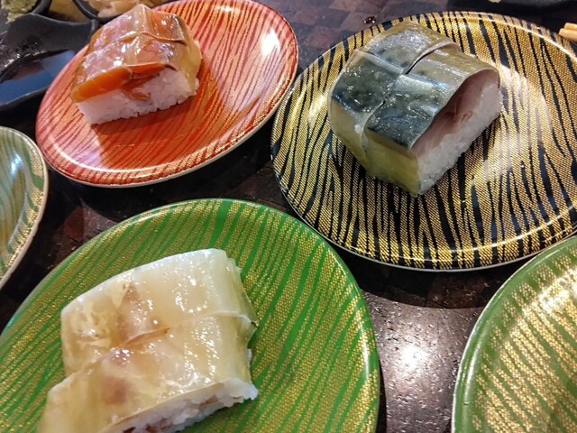 鯖の押し寿司は身がごはんと同じくらい分厚く、酢がきいていて大好き、2皿食べてしまう時もあります