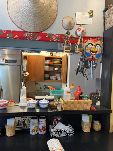 外に面した小窓から、鯖のバインミーSサイズと鶏の冷製レモンフォーSサイズ、もちろんビールもオーダーして、店内へ