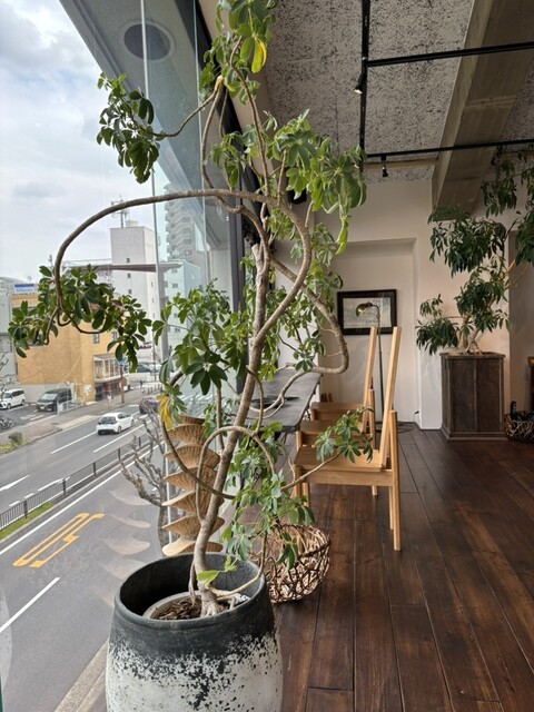 眺めの良いカウンターに着席、店内のグリーンにも癒されます