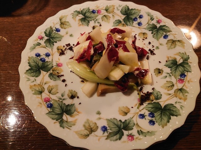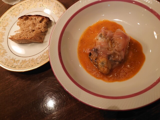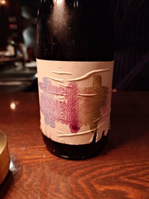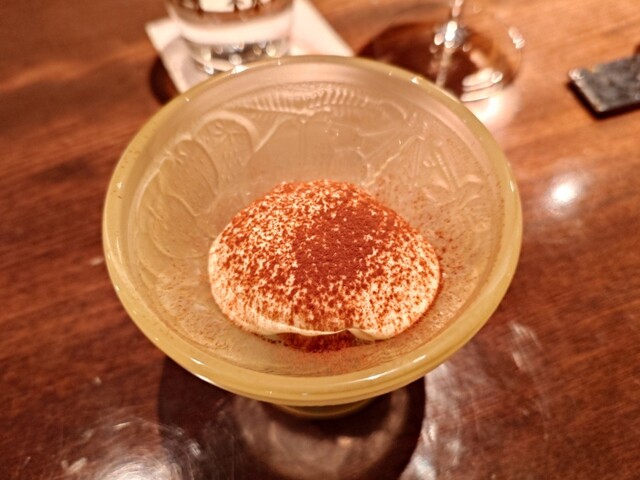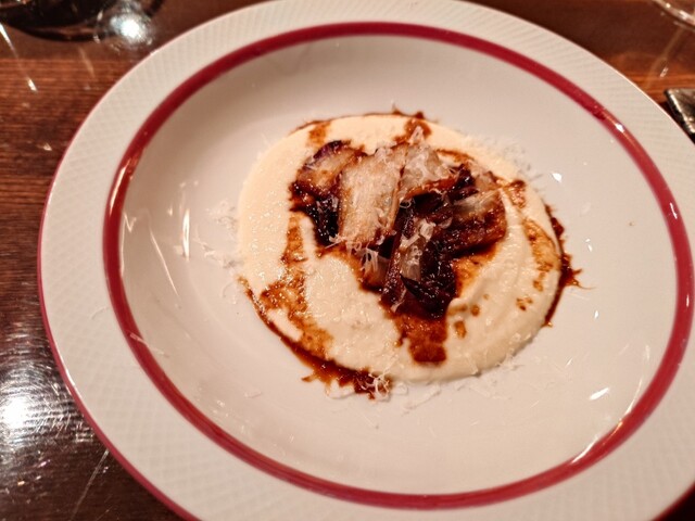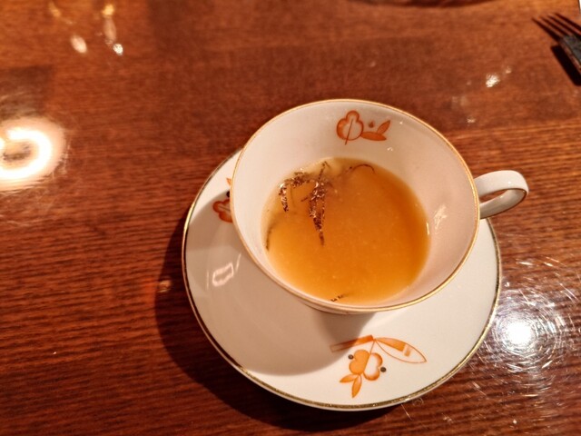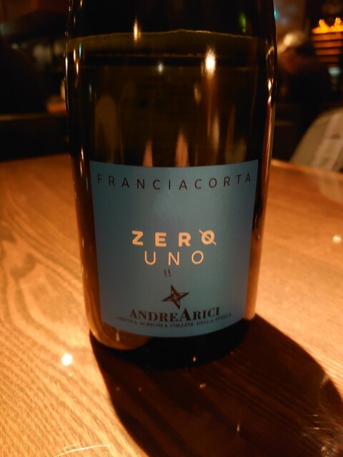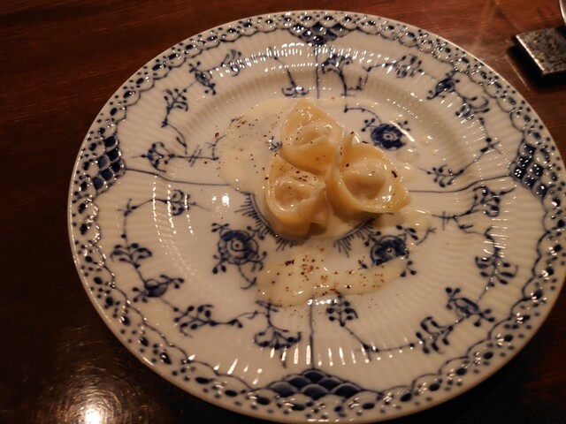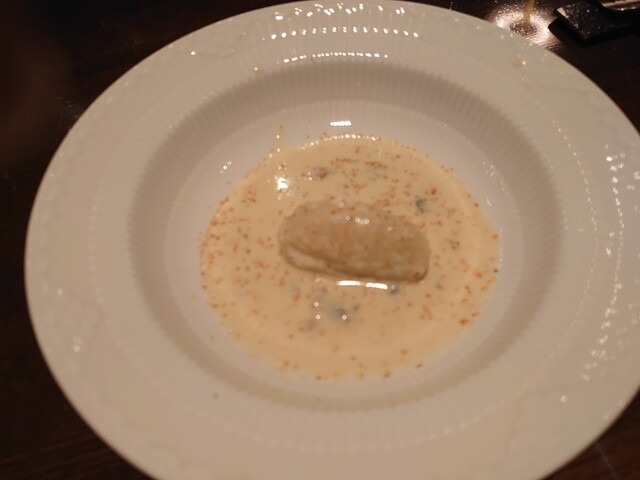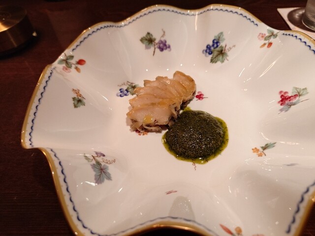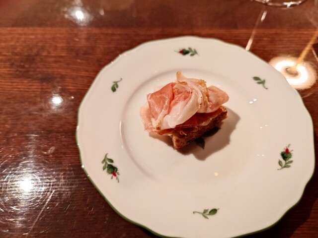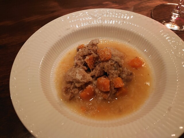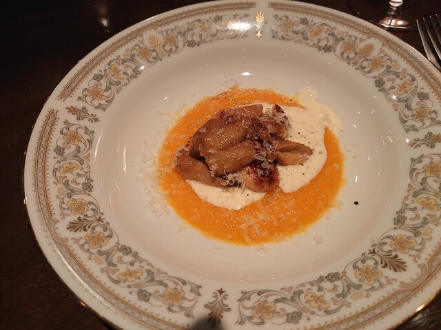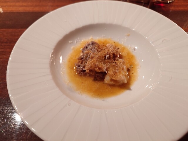 まずはフランチャコルタナチュール。厚みのある、酸味も苦味もあるワイン。アミューズは小さいシュウマイのよう。中にはたぶん猪。ソースはチーズ。味わい深い。