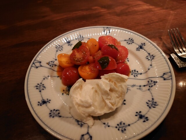 カプレーゼ。トマトと熊本の晩柑にモッツァレラチーズ。トマトフレッシュで美味しい。イタリアコリオのソービニヨンブラントマトの味わいとよく合います。