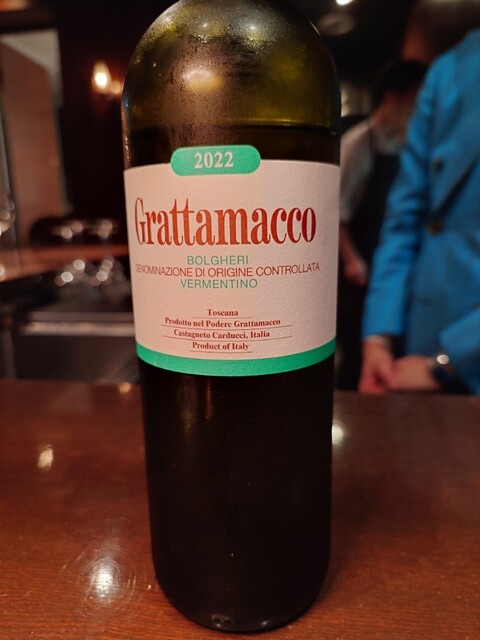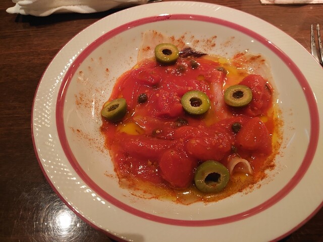 ワインはボルゲリのヴェルメンティーノ。ミネラルの味わい。自家製メカジキの生ハムにフレッシュトマトソース。グリーンオリーブ。このオリーブのミネラルと良く合います。