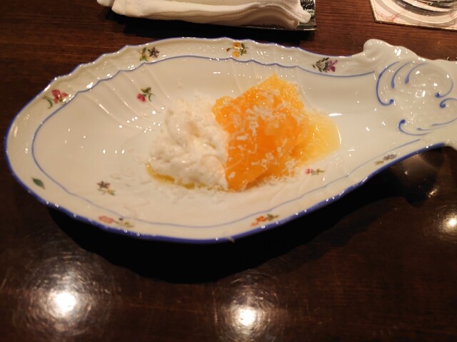 ワインはドイツのリースリング。少し甘め。カビネット。いろんな柑橘のカプレーゼ。わ−このリースリングはオレンジの香りと酸味の味わいがすごーく合う。
