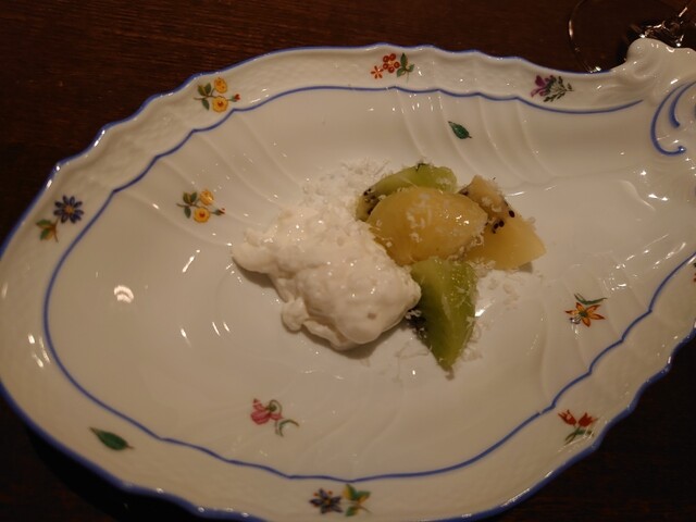 今日は前菜おまかせ。ワインもペアリングでお願いしました。まずはフランチャコルタ。ブラッダーナチーズにキウイ。サンセールの白。生しらすオレンジの香り。オリーブオイル和え。シンプルですが、美味しい。