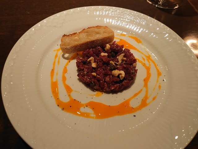 締めは前菜に戻りすみません。馬肉のタルタルにヘーゼルナッツ。