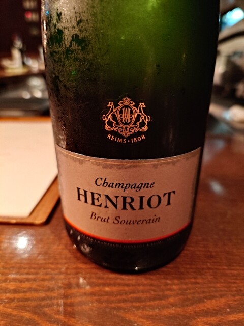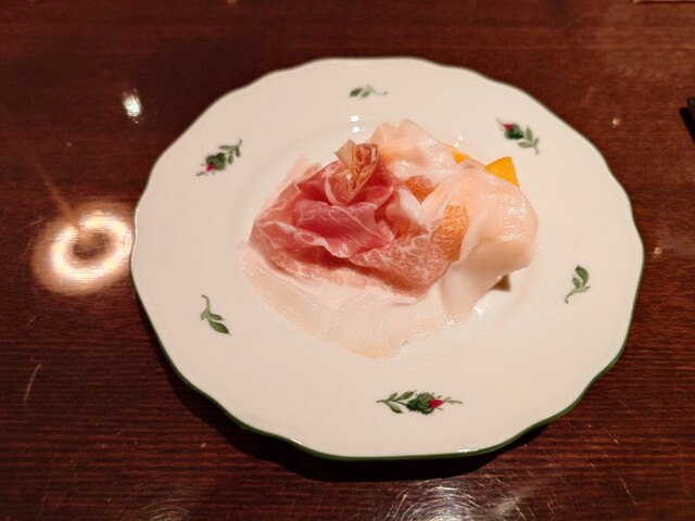 まずはシャンパーニュ。ゴッセ。前菜はプロシュートに甘熟柿。美味しい組み合わせ。プロシュートは緊急事態宣言下、閉店中にいい感じで水分が抜けていると。