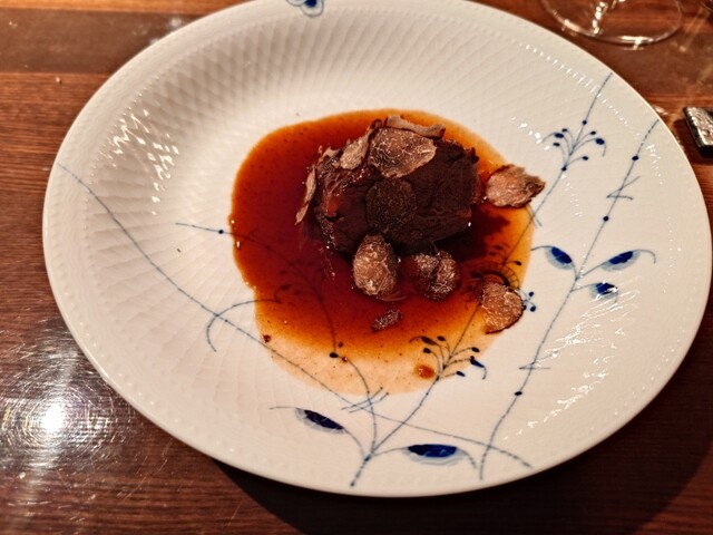 パスタはジビエ鹿だった?ショートパスタ。黒トリフたっぷり。イタリアアマローネヴァルポリチェッラ。こちらはボルドー。パスタは私のパスタの概念を打ち破ってくれました。これは肉料理。複雑な味わい。