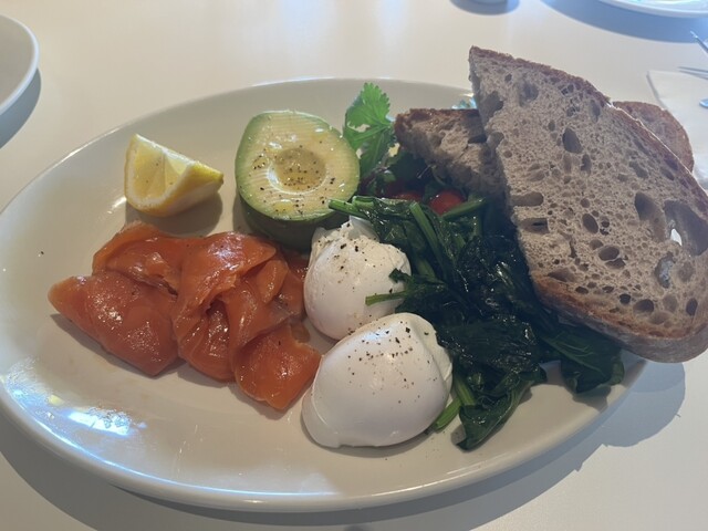 土曜朝10時頃に来店。『世界一の朝食』と称される朝食…一度は食べたいと思い、行ってみました!店内は広々と明るく、ソファの座り心地がいい。だるそうにしてる店員さんはおらず、気持ちの良い接客をしてくれました。⚫︎注文「フレッシュオージーブレックファスト」サーモン、ポーチドエッグ、チェリートマトサルサ、アボカド、ほうれん草のプレート。栄養バランスは良いし、毎朝食べたいおいしさでした。連れはリコッタパンケーキを頼みました。パンケーキはふわふわ、上に乗ってるハニーコームバターが上品な味わい、とっても美味しかった!値段は少し高めだなと思いましたが、相応のクオリティです。お台場に泊まったら、必ずまた行こうと思います。