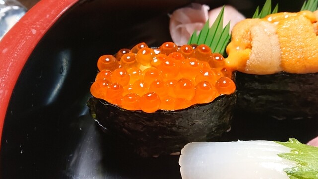 茶碗蒸しが素晴らしい。上品なカツオだしがたっぷり使われた逸品で、なめらかかつ見事な仕上がり。椎茸がたっぷり入っているのも好印象。握りも素晴らしいですね。マグロの脂の味そのものを純粋に楽しめる大トロ、グニグニねっとりの甘さがクセになるイカ、甘み濃厚なホタテ。甘エビも暴力的なまでに問答無用のうまさ。イクラにウニはもちろんの王道のうまさ。少し大ぶりながら、シャリとネタのバランスもよく、シャリそのものの粒立ちや酢加減も絶妙。いつも出前でしかいただいたことがありませんが、極めて秀逸な握りだと改めて感心します。