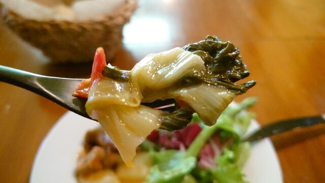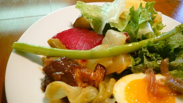 テーブル席に案内され、しばしメニューとにらめっこ。実力を見るにはパスタだと心に決めていたので、”石巻産鮮魚の真子と国見産ミニトマトのスパゲットーニ”1370円(前菜、パン、ドリンク付き)を頼む。メニューには、シチリア版たらこスパゲッティとの注釈が。まずは前菜のサラダ類。サラダにアスパラ、ラタトゥイユ、芋、赤カブのマリネらしきものなど、バラエティ豊かな野菜料理が並ぶ。どれも野菜の味が濃くて素晴らしいお味です。特にアスパラはひょろ長くて頼りなさげな感じでしたが、味は確か。枝豆のような濃い旨味が口中に残り、素材の持つ強さに圧倒される。ネギのマリネか漬物みたいなやつも、ぬか漬けみたいな味がして印象的な一口。これがお代わり自由ってんだから、恐ろしいお店です。