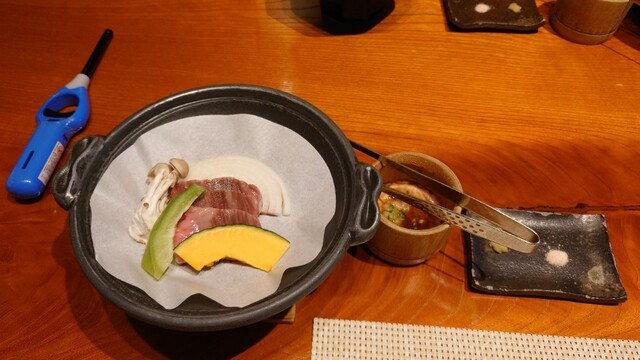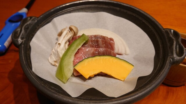 四 隣人袴 米沢牛ランプ陶板焼き (日本のブランド米沢牛は隣町の誇りです)