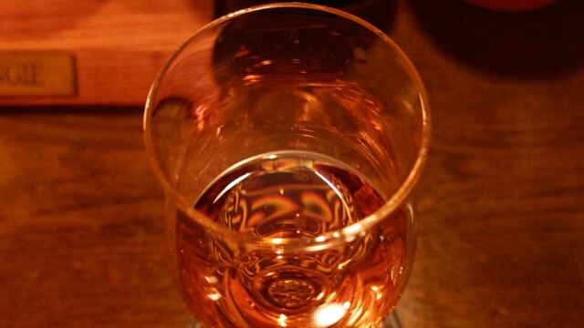 お次はフォアローゼズのブラックをストレートでいただきます。通常のボトルよりもアルコールのピリッとした感じがこなれていて飲みやすい。バーボンの中では甘く華やかで、ねっとりとした香気のある液体をなめるようにいただく。途中でアマレットをかけた柿とブドウのサービス。アマレットの柿がなかなか不思議ですてきなお味。