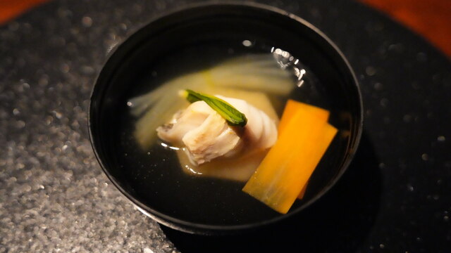次鋒は吸い物ですが、カブやニンジンなどのお野菜はもちろん、甘鯛がすばらしいですね。柔らかい旨味が口中に広がって、早速お酒が飲りたくなります。