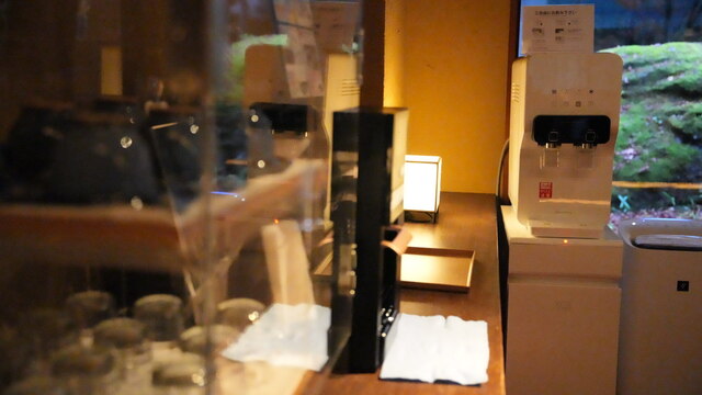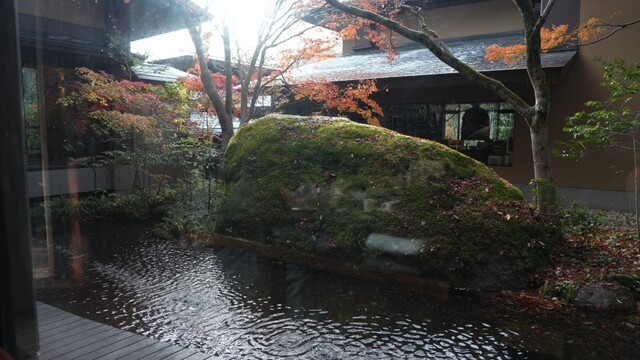 しばらく館内を散策し、お湯をいただいて18時から夕餉のはじまり。竈神という名の食事処でたっぷりのコースをいただきます。長い廊下の脇に、中庭を見渡せる個室が配置され、宿泊客それぞれで食事を取ることができる。